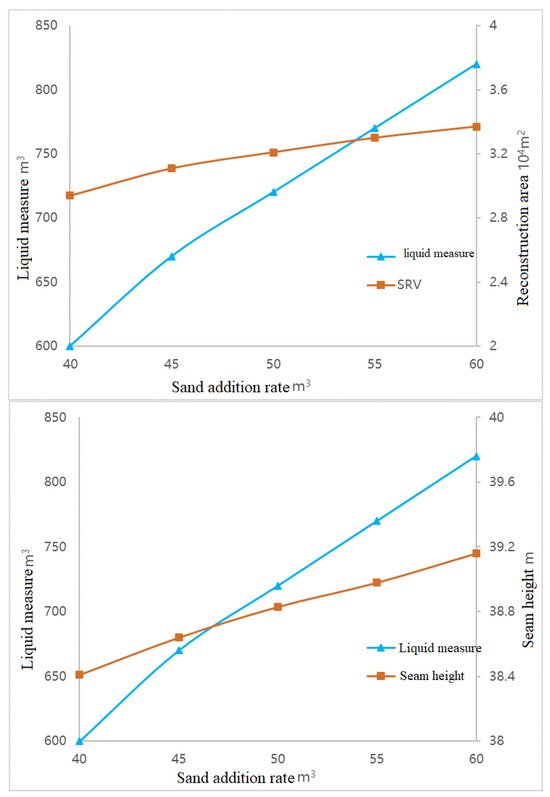Another aspect to consider is fracturing scale optimization. With the increase in fracturing scale, the fracture height increases from 38.5 to 39.5 m. The stimulated area also increased, which ranged from 2.9 × 104 m2 to 3.4 × 104 m2. As can be seen from Figure 8, SRV tends to increase with the increase in fracturing scale. When the SRV reaches a certain extent, it is difficult to achieve more, and the fracture height and stimulated area have a very small increase with the increase in the scale. Considering the safety and cost comprehensively, the fracturing scale with 50 m3 sands + 700 m3 liquids was adopted, which can meet the treatment requirements.