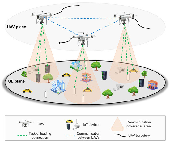 As shown in Figure 1, this paper presents a UAV-assisted MEC system that consists of multiple UAVs collaborating to provide services to a UE group. The UAVs primarily receive data from the UE and process it, which is denoted by . It is assumed in this paper that there are N randomly distributed UE in the system, which is represented by .