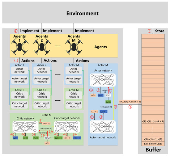 The stored is then extracted into the network structure. Different actor networks take the respective agent’s observation as inputting and outputting the corresponding predicted actions (labeled as ➄ and ➅ in Figure 4). Different actor target networks take the respective agent’s observation as inputting and outputting the corresponding predicted actions (labeled as ➆ and ➈ in Figure 4), which together form the predicted actions for all agents at the next time step.