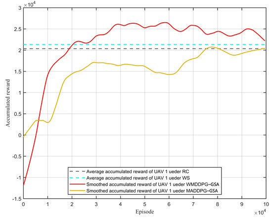 The reward function in the training process is then compared with three baseline algorithms, and the corresponding results are presented in Figure 6. Specifically, we conducted simulations using the WS algorithm and the RC algorithm on 100 randomly generated environments. The average objective function value obtained for the WS algorithm was found to be 21,340.74, while that for the RC algorithm was determined to be 20,355.01. The reward function of the WMDDPG-GSA algorithm initially increased and surpassed that of the WS and RC algorithms within the first 20,000 training steps. When comparing it to the MADDPG-GSA algorithm, we can observe that the MADDPG-GSA algorithm converges around 80,000 steps with significantly inferior convergence compared to the WMDDPG-GSA algorithm. This suggests that combining the WS algorithm with MADDPG can accelerate convergence speed and enhance convergence effectiveness.