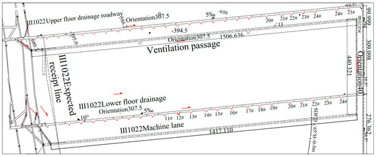 To investigate the multi-purpose effect of “ cross-layer drilling”, two upward cross-layer drilling groups were constructed in the lower floor drainage roadway of the III1022 working face. The principle of annular drilling was adopted, as shown in Figure 10, and the C1 and C2 group drillings consisted of five drillings each. In each, one drilling was for water injection, and the remaining four drillings were water injection efficiency inspection holes.