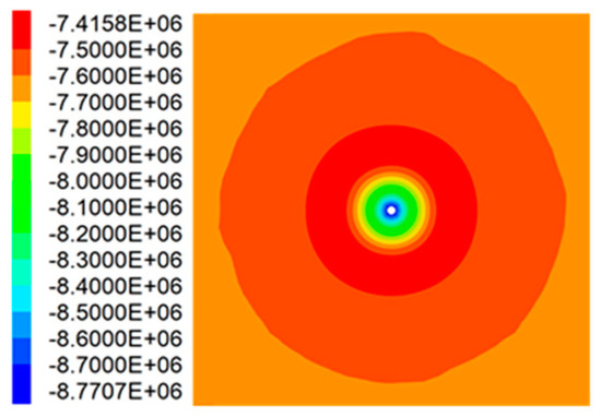 As shown in Figure 4, taking the water injection pressure of 6 MPa as an example, when the water injection pressure is constant, the hydraulic influence area is quasi-circular. With the increase in water injection time, the hydraulic influence range gradually expands, and the stress concentration area is affected by the water injection, which gradually moves away from the borehole along the radial direction of the borehole. When the water injection time is fixed, with increasing water injection pressure, the diffusion range of the water along the radial direction of the borehole increases, and the diffusion speed also increases. At the same position as the distance from the borehole, the pore pressure increases. The diffusion rate of the water increases nearly uniformly with the increasing water injection pressure.