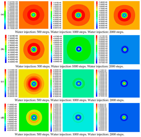 Pressure–stress evolution nephogram of water injection under different overburden pressure conditions: (a) 6 MPa; (b) 8 MPa; (c) 10 MPa; and (d) 12 MPa.