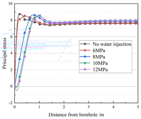 As shown in Figure 5, the stress exhibits a decreasing trend, followed by an increase, and then stabilizes with increasing distance from the borehole. This phenomenon can be attributed to the impact of the water injection in the surrounding coal seam. Specifically, water injection leads to an increase in the pore water pressure, which partially offsets the overburden pressure, resulting in a decrease in the principal stress around the borehole. However, as the water injection pressure continues to rise, the stress around the borehole also increases. This leads to an expansion of the pressure relief area, consequently enhancing the effectiveness of the pressure relief. Furthermore, with the progressive increase in the water injection pressure, the range of the stress concentration area shifts towards deeper regions of the coal seam.