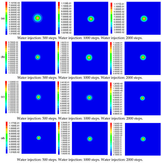 Evolution cloud diagram of the permeability under different water injection pressures: (a) 6 MPa; (b) 8 MPa; (c) 10 MPa; and (d) 12 MPa.