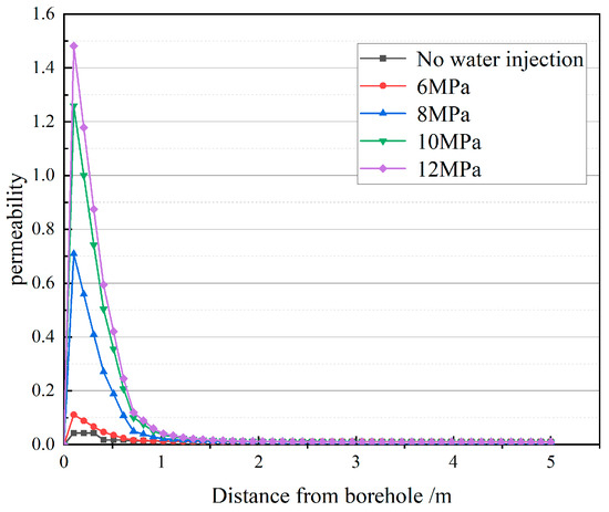 Figure 7 shows the permeability distribution of the coal around the borehole. When the water injection time is fixed, the water injection pressure gradually decreases from its highest point at the borehole wall to a point away from the borehole until it reaches the original permeability. However, the increase in the coal permeability differs under different water injection pressures. The maximum permeabilities of coal corresponding to water injection pressures of 6 MPa, 8 MPa, 10 MPa, and 12 MPa are 0.04, 0.11, 0.71, 1.26, and 1.48, respectively, which are 1.75%, 16.75%, 30.5%, and 36% higher than the original permeability of the coal. In the effective wetting range of the coal body, a greater water injection pressure at the same position corresponds to a greater permeability of the coal body. Therefore, the effect of a low water injection pressure on the fracturing and permeability enhancement of a coal body is not obvious, and the permeability does not change significantly. Under the action of a high water injection pressure, the pores and fissures in the coal body are interconnected, which increases the migration channels of the water in the coal body, and the permeability changes significantly. Therefore, increasing the water injection pressure properly can increase the permeability of the coal and improve the effect of water injection.