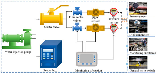 According to the evolution law of the stress–seepage field and the field practice of coal seam water injection, real-time acquisition-segment precision control technology for the physical parameters of the water injection power and liquid injection, with a programmable information control system as the core, was developed. Based on existing monitoring sensing technology and automatic control theory, the core of the field equipment is the logic controller, and the water injection parameters and liquid injection properties are its control objects. At the same time, it is equipped with a data monitoring substation, a real-time transmission module, and an intelligent transmission unit. The field equipment can complete intelligent data acquisition, transmission, and processing and real-time system response feedback control and realize the dynamic monitoring and control of the water injection dynamic parameters. The process principle of the field equipment is shown in Figure 9.