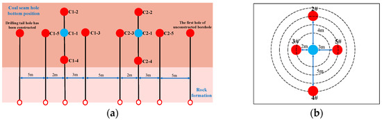 Schematic diagram of the drilling construction: (a) section diagram and (b) coal point layout for the boreholes.