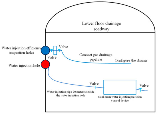 According to the schematic diagram of the pipeline connection between the water injection hole and the efficiency inspection hole in Figure 11, the rapid connector is used to connect the precise measurement and control device for the coal seam water injection with the existing water injection pipeline and access the C1-1 water injection hole after sealing. After sealing, the C1-2, C1-3, C1-4, and C1-5 efficiency inspection hole ends are equipped with a gas–water pressure monitoring device and a drainage pipe with a valve that can display and save data. After the pipeline connection is completed, the water injection pump is used to inject clean water. By observing the change in the pressure gauge at the end of the efficiency inspection hole, the change in gas–water pressure in each efficiency inspection hole is judged. When the pressure of the water injection pump is reduced to about 30% of the peak pressure, and the change in the pressure gauge at the end of the efficiency inspection hole tends to be stable, the water injection is stopped.