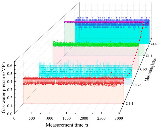 The variation law of the gas pressure in the borehole shown in Figure 13 indicates that within the monitored time range, the pressure changes in each borehole fluctuated within a certain range and did not fully reach the equilibrium state. The fluctuations in the C1-3 and C1-4 boreholes of the efficiency inspection hole were small, and the change in the gas pressure was relatively stable. The fluctuations in the C1-1 and C1-5 boreholes of the water injection hole were relatively large, and the fluctuation in the C1-2 borehole of the efficiency inspection hole was the largest. The stability of the gas pressure was poor, which was due to the analysis process. The variation law of the average gas pressure in the borehole was as follows: from C1-1 to C1-2, the average gas pressure decreased; from C1-2 to C1-4, the average gas pressure gradually increased; and from C1-4 to C1-5, the average gas pressure slowly decreased. The diagram also indicates that the air tightness of each borehole and the connecting pipeline outside the borehole were good, and that a good pressure holding effect was successfully realized.