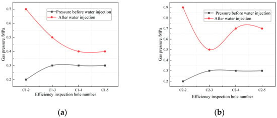 Gas–water pressure change curve in the inspection hole before and after water injection for (a) group C1 and (b) group C2.
