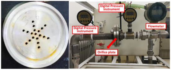 In this work, the schematic diagram of the HC equipment is shown in Figure 2, and the physical picture of the HC device is shown in Figure 3. The components and functions of the device are listed in Table 2. The functions of the HC device are listed in Table S1 of the Supplementary Materials. The equipment was composed of a tank (150 L), a booster pump (rated power, 2.2 kW; rated flow, 2 m3/h; head, 81 m), and regulating valves (V1, V2, and V3), pressure gauges, and a flowmeter. Perforated plates were used as the HC generator, which were made of stainless steel and fitted in the main line. The tank was designed with a condensing tube to adjust the temperature of the liquid. Pressure gauges were set to measure the inlet pressure (p1) and fully recovered pressure (p2) downstream (p1 and p2 are absolute pressures). The flowmeter was installed on the main line to measure the flow rate. The temperature was measured by a thermocouple.