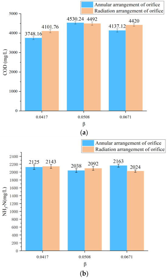 The effect of β and arrangement of orifices on the removal of (a) COD and (b) NH3-N. The reaction time was 60 min, and pH = 7.18.