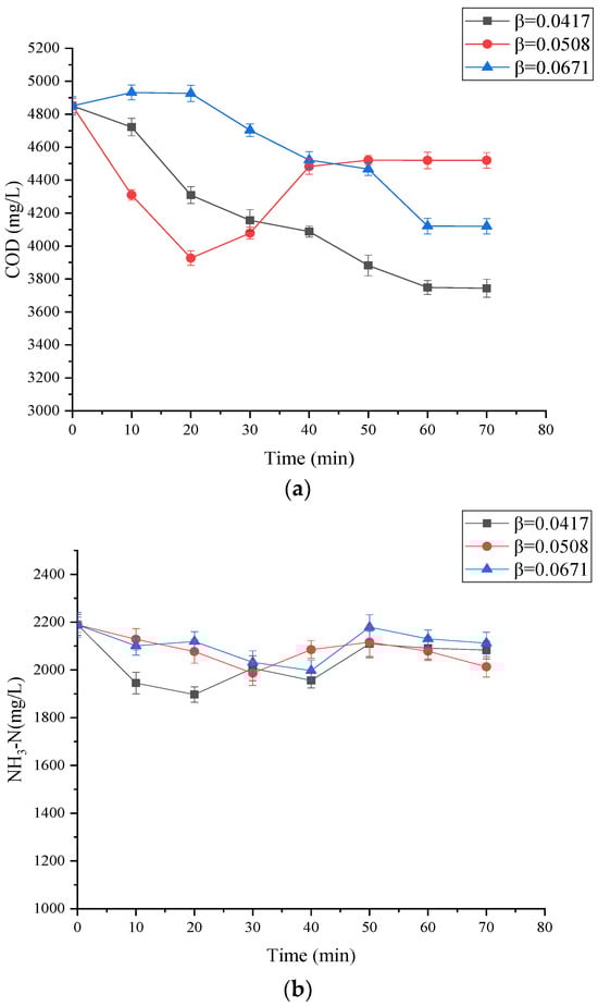 From Figure 6a, when β = 0.0417, the COD continued to decrease with the increase in reaction time and dropped to 3748.16 mg/L at 60 min. When β = 0.0508, the COD decreased rapidly to 3960.32 mg/L within the first 20 min, but it increased significantly from 20 min to 40 min. After 40 min, COD stabilized at 4530.24 mg/L. When β = 0.0671, the COD increased slightly above the initial value at the beginning of the reaction, then decreased slowly, and also decreased steadily to 4134.12 mg/L at 60 min. The phenomenon of rising COD is similar to that in Martin Petkovšek’s study [39].