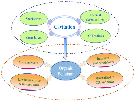 The efficiency of the degradation of organic pollutants present in the LL by HC was investigated in terms of changes in BOD5 and BOD5/COD. In Table 4, the results showed that many effects of the HC process could destroy the molecular structures of organic matters and convert non-biodegradable organic pollutants into different forms that are more biodegradable, including shockwaves, shear forces, thermal decomposition, and •OH radicals. In addition to obtaining a more favorable biodegradability, this pretreatment resulted in the partial reduction in total contaminant load. The schematic diagram of the HC pretreatment principle for LL is shown in Figure 7.