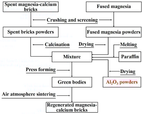The synthetic process flow chart of regenerated magnesia-calcium bricks with Al2O3 powder addition.