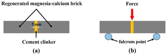 The hot flexural strength of the regenerated samples was determined using the three-point bending test method. Each regenerated sample was placed into a CMT 5204 temperature-mechanical load coupling testing machine and heated to 1573 K at a rate of 5 K/min. The maximum force required to break each kind of regenerated sample was determined after maintaining 1573 K for 30 min.