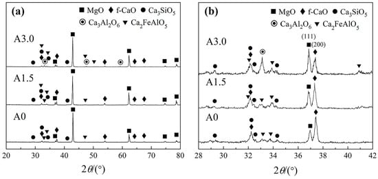 Figure 3a shows the XRD patterns of samples A0, A1.5, and A3.0. The results indicate that the main phase compositions of the samples A0 and A1.5 were identical to those of magnesia (MgO), free calcium oxide (f-CaO), tricalcium silicate (Ca3SiO5, C3S), and tetracalcium aluminoferrite (Ca2FeAlO5 and C4AF), whereas the main phase compositions of the sample A3.0 were MgO, f-CaO, C3S, C4AF, and tricalcium aluminate (Ca3Al2O6, C3A). This shows that a new C3A phase was generated and other phases did not change according to the increase in Al2O3 content in the regenerated samples.