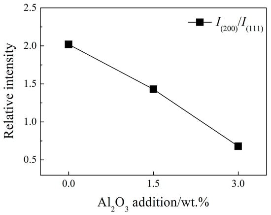 Figure 3b shows that the intensity of the characteristic diffraction peaks of f-CaO [ICaO(200)] and MgO [IMgO(111)] were the two highest peaks in the range of 28–42° and varied significantly. The relative intensities of ICaO(200)/IMgO(111) decreased observably along with an increase in Al2O3 content in the regenerated magnesia-calcium bricks, as shown in Figure 4. It also indicates that the content of f-CaO decreased along with an increase in Al2O3 content in the regenerated samples because the phase of MgO was exclusive and stable in the regenerated samples, as shown in Figure 3.
