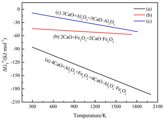 Figure 3 shows that the element Fe in the regenerated samples existed only in the C4AF phase, and the element Al in the regenerated samples existed in both the C4AF and C3A phases. The standard Gibbs energy of reactions between Fe2O3, Al2O3, and f-CaO which generate C4AF and C3A, are shown in Figure 5 of lines a and c []. This shows that the phase of C4AF generates preferentially when the impurity elements of Fe and Al exist concurrently, and the phase of C3A generates when there is excess Al element impurity (the mole ratio of Fe2O3 to Al2O3 < 1). In addition, a preliminary study proved that the phase of dicalcium ferrite (Ca2Fe2O5, C2F) is generated when the mole ratio of Fe2O3 to Al2O3 is >1 [], and the standard Gibbs energy of the reaction between Fe2O3 and f-CaO for generating C2F is shown in Figure 5 of line b [].