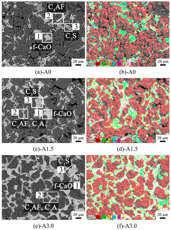 Figure 6a,c,e show the SEM images of the regenerated samples’ surfaces, and Figure 6b,d,f show the element distribution of the regenerated samples’ surfaces. It shows that the white phases shown in the selected areas 1, 2, and 3 in Figure 6a,c,e are f-CaO, C4AF or C4AF-C3A, and C3S phases, respectively, whereas the dark phases shown in Figure 6a,c,e are all MgO phases based on the element distribution shown in Figure 6b,d,f, and these calcium-based phases became more and more continuous along with an increase in Al2O3 content in the regenerated samples. Moreover, it indicates that the phases of C4AF and C3A showed a tendency of aggregation in samples A1.5 and A3.0. This is because the elements of Fe and Al existed in the form of a liquid phase at the firing temperature (1873 K), and the C3A phase (melting point of 1808 K []) and C4AF phase (melting point of 1688 K []) successively crystallized from the liquid phases and sintered together during the furnace cooling process.