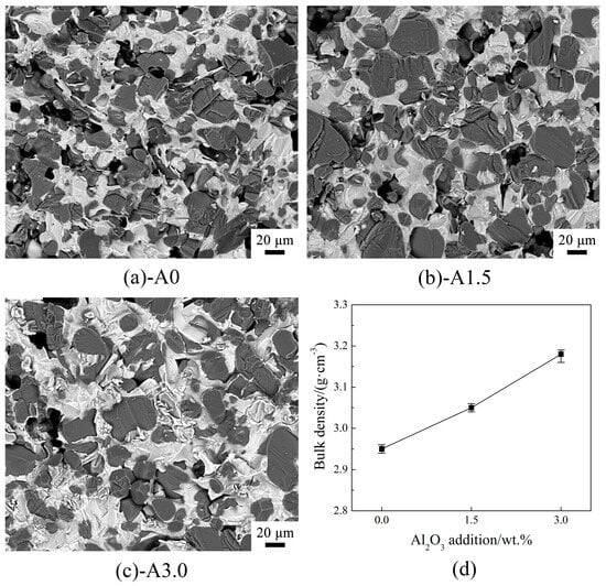 Figure 7a–c show the SEM images of the regenerated samples’ fractures, and Figure 7d shows the bulk density of the regenerated samples. It can be seen that the compactness of the regenerated samples was enhanced along with an increase in Al2O3 content in the regenerated samples. This is because the content of the liquid phase in the regenerated samples at the firing temperature increased along with an increase in Al2O3 content in the regenerated samples, and it improved the sinterability of the regenerated samples.