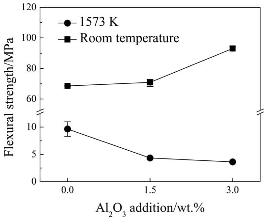 Figure 8 shows the results of the room temperature and the hot (1573 K) flexural strength of samples A0, A1.5, and A3.0. This indicates that the room-temperature flexural strength of the regenerated samples increased, and the hot flexural strength of the regenerated samples reduced with Al2O3 content increasing. This is because, with an increase in Al2O3 content in the regenerated samples, the density of the regenerated sample increased on the one hand, as shown in Figure 7d, leading to an increase in its room-temperature flexural strength, and on the other hand, the regenerated sample generated more low-melting-point phases (such as C4AF and C3A), as shown in Table 3, resulting in a decrease in its hot flexural strength.