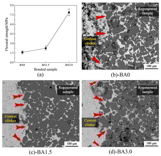 The flexural strengths of the bonded samples BA0, BA1.5, and BA 3.0 are shown in Figure 9a. It shows that the flexural strengths of the bonded samples were enhanced along with an increase in Al2O3 content in the regenerated samples; that is, there was an increasing tendency of the kiln coating adherence as Al2O3 content in the regenerated samples increased.