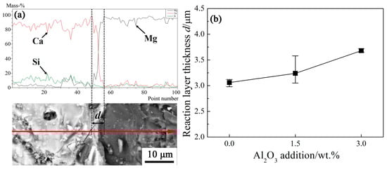 Moreover, the reaction between the cement clinker and the phase of MgO, which was the major phase of the regenerated sample, was carried out by an element distribution scanning analysis across their contact areas, as shown in Figure 10a. This indicates that a reaction layer containing Ca, Sim, and Mg existed on the interfacial surface of these contact areas. The thickness d of the reaction layer gradually became larger with increasing Al2O3 content in the regenerated samples, as shown in Figure 10b, which also indicates aggravating corrosion of the cement clinker to the phase of MgO.