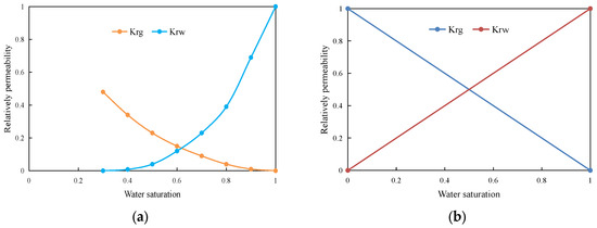 Gas-water relative permeability curves used for model validation. (a) Relative permeability curve in the reservoir. (b) Relative permeability curve in the hydraulic fracture.