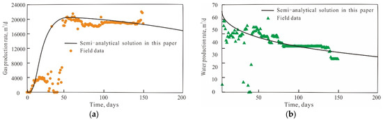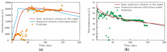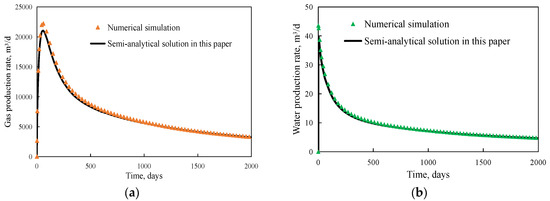 Comparison of gas and water rate between the semi-analytical model in this paper and the Eclipse. (a) Gas rate validation with the numerical solution. (b) Water rate validation with the numerical solution.