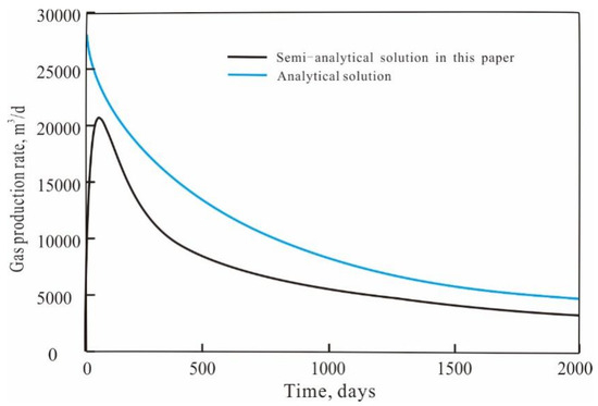 Comparison of gas production rate between the proposed semi-analytical model and the analytical model.