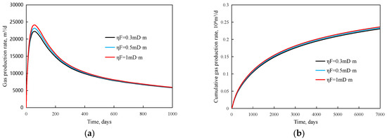 Effect of fracture conductivity on gas production rate. (a) Influence of ηF on gas production rate. (b) Influence of ηF on cumulative gas production rate.