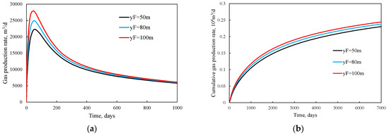 Effect of fracture half-length on gas production rate. (a) Influence of yF on gas production rate. (b) Influence of yF on cumulative gas production rate.