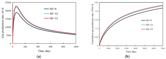 Effect of number of hydraulic fracturing stages on gas production rate. (a) Influence of NF on gas production rate. (b) Influence of NF on cumulative gas production rate.
