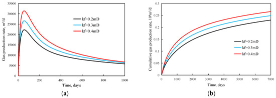 Effect of permeability of the coal cleat in the inner reservoir on gas production rate. (a) Influence of kf on gas production rate. (b) Influence of kf on cumulative gas production rate.