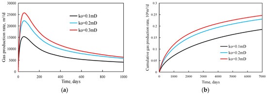 Effect of permeability of the coal cleat in the outer reservoir on gas production rate. (a) Influence of ko on gas production rate. (b) Influence of ko on cumulative gas production rate.