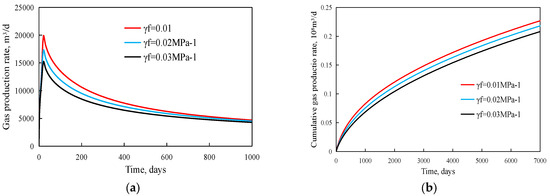 Effect of permeability stress sensitivity of the coal cleat on gas production rate. (a) Influence of γf on gas production rate. (b) Influence of γf on cumulative gas production rate.