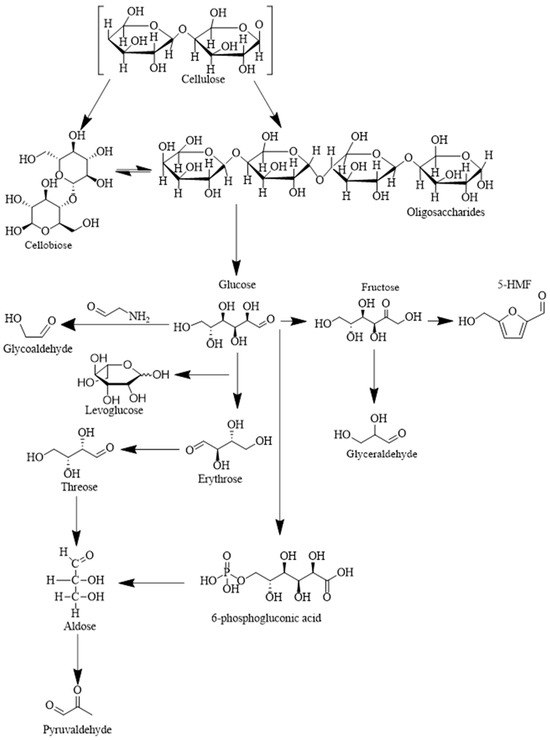 5-HMF is generated in the process of the dehydration of fructose and its subsequent transformation into derivatives at 378 °C in an acidic environment. 5-HMF is treated as a derivative of furan, characterized by the linkage of the furan ring to a hydroxymethyl group. In cellulose hydrolysis, the generation of various secondary products (e.g., levulinic acid, formic acid, and humic acid) is expected. It is noteworthy that the formation of these byproducts may influence the yield of 5-HMF. In practice, yielding 5-HMF, but not glyceraldehyde, is observed at 380 °C with a residence time of 15 s, as concluded in the literature [23].
