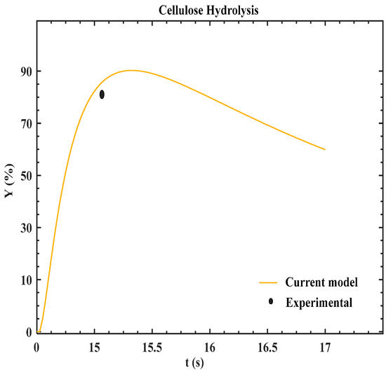 where the hydrolysis reactor is assumed as a cylindrical tube of constant temperature and pressure, is the volume of the entire reactor tube, and A = is the cross-sectional area, with the tube diameter D = 0.0032 m as used in the experimental study [18]. In addition, is the flow rate, and t is the entire reaction time of the cellulose undergoing in the reactor tube [5]. The conversion rate of cellulosic biomass is one of the process indicators used to assess how efficiently cellulose is being depolymerized into its derivatives. For instance, a higher conversion rate corresponds to a faster product yield. The conversion rate X in cellulose hydrolysis is defined as