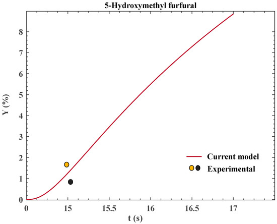 The derivative yield at the residence time of 15 s is acceptable. Both modeling and experiments can generate reasonable results at the beginning of the 378 °C temperature, and experimental 5-HMF yields of 0.9% and 1.3% are plotted in Figure 5. In addition, the rate constant of the 5-HMF generation reaction was also studied to show its increase with increasing temperature in a specific temperature range [33].