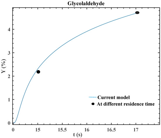 Temperature and residence time influence the reaction kinetics. Experimental observations did not confirm the generation of glycolaldehyde [18]. However, the present model does predict the yield of glycolaldehyde at the concentration of 2.1%, under the condition of 378 °C with a residence time of 15 s, as shown in Figure 7. Furthermore, close yields can be achieved under comparable circumstances of similar temperatures and with extended residence times of >15 s, specifically at 17 s. Remarkably, given the reaction temperature, the extension of the residence time results in a yield of 2.1 to 4.3%, as shown in Figure 7.