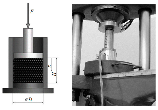 A compression device (MPTest 5.050, Labortech, Opava, Czech Republic) was used in the compression tests. Copra was pressed in a metallic pressing vessel (Figure 1) equipped with a press plunger, with a diameter of 60 mm and a height of 100 mm [26]. The holes in the bottom of the pressing vessel allow the easy draining of the pressed oil.