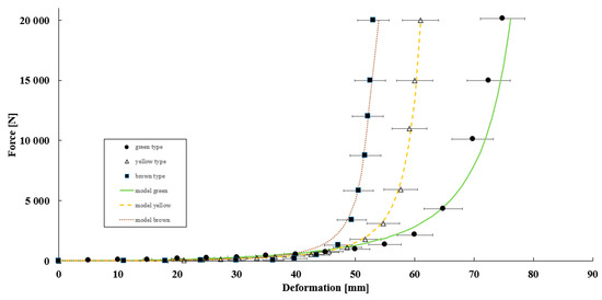 The physical parameters of copra such as moisture content Mc = 6.9 ± 0.5% (w.b.) and particle size Ps = 3.2 ± 0.3 mm were constant. The oil content of copra Oc was 61.3, 65.7, and 66.8% for the green, yellow, and brown type, respectively. The measured values of single pressing curves for the different types of coconut are shown in Figure 3. The measured values of pressing force and deformation for the individual types of coconuts were fitted using a tangent curve.