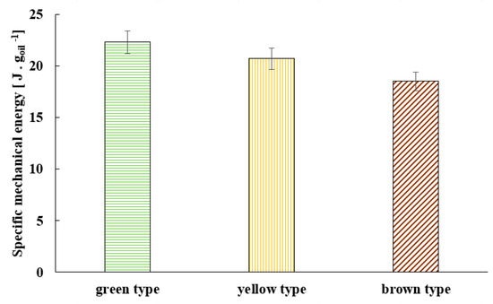 The coefficients of the equation were determined in MathCad 14 software (PTC, USA) using the genfit function, which uses the Levenberg–Marquardt algorithm [27,28]. A very strong dependence between the measured values and the proposed model (Equation (1)) is shown by the statistical analysis ANOVA (analysis of variance), which proves the suitability of using the tangent function for data fitting. The measured values of compressive force for the different types of coconuts and results from the tangent model (Equation (1)) were statistically significant at the level of significance of 0.05. This means that Fcrit values (specific value comparing two models) were higher than Frat values (F—test value), and p-values (significance level at which the hypothesis of equality of models can be rejected) were higher than 0.05 (Table 2). This is also confirmed by the very high value of the coefficient of determination R2. The deformation energy was calculated using Equation (2) and is 230, 190, and 180 J for the green, yellow, and brown type, respectively. The measured values of deformation energy are significantly lower than those of other types of oilseeds [36]. Based on the calculated energy and the obtained oil, the specific mechanical energy was determined, and its values are shown in Figure 4.
