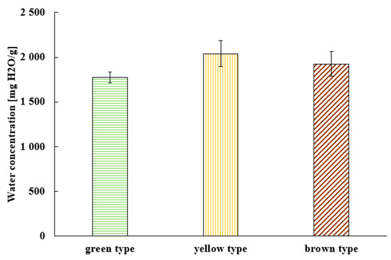 In terms of the energy consumption of oil pressing, the most suitable variant is the brown type, which achieved a 17.4% lower specific energy per gram of obtained oil compared with the other types. Similar values were also measured by the authors of [26], who studied the energy intensity of coconut oil pressing. The oil yield was calculated using Equation (3) and is 0.192, 0.224, and 0.247 for the green, yellow, and brown type, respectively. Regarding the chemical and lubrication properties, one of the parameters that has been calculated is the water concentration, which is shown in Figure 5.