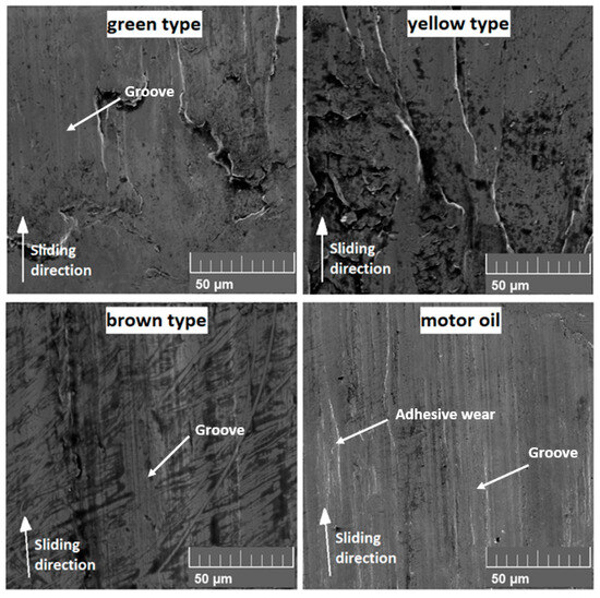 The worn surface of the pin after the Reichert test was analyzed using scanning electron microscopy (SEM), which is shown in Figure 7. The images show different pins for different types of lubricants.