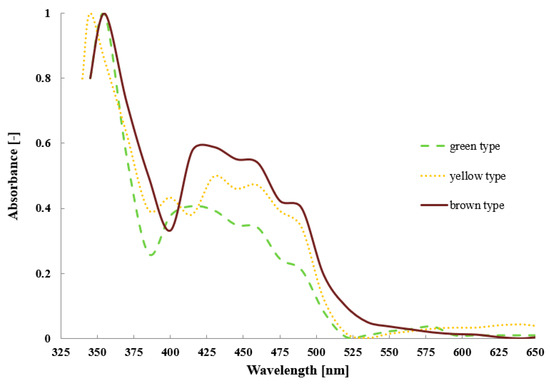 The measured absorbance values of the individual types of coconut oils in the wavelength range of 325–600 nm are shown in Figure 8. The indicated wavelength represents the UV–visible absorption spectrum. The spectra showed a wide level of variation with predominant peaks at 355 and 425 nm. The measured curves for the individual types of coconut oil show similar absorbance values and the same peak band. A very strong absorption peak at 350 nm is seen in all types of oils and is probably due to chlorophyll and carotenoid pigments [49]. Two absorbance peaks in the 325–600 nm wavelength band are typical for coconut oil. Similar curves are reported by other authors for virgin coconut oil [50].