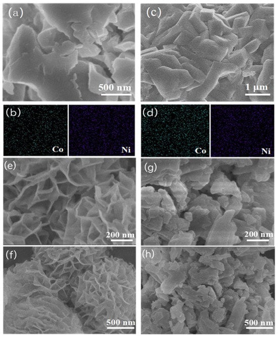 Scanning electron microscopy and energy spectrum of (a,b) NiCo-UMOFs and (c,d) NiCo-MOFs; SEM images of (e,f) Ni-MOFs and (g,h) Co-MOFs at different scanning sizes.