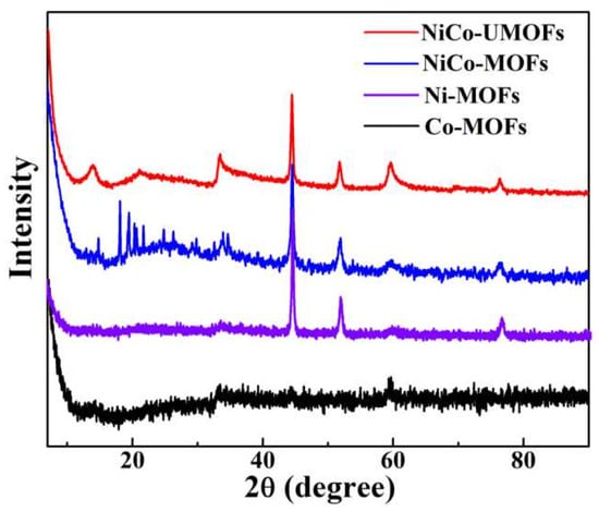 The X-ray diffraction images of NiCo-UMOFs and NiCo-MOFs are shown in Figure 2. As we can see, the strong diffraction peaks appear in Ni-MOFs at 2θ degrees of about 45º, which is attributed to the nickel peak. The XRD pattern of Co-MOFs exhibited weaker peaks at 2θ degrees of 33.5°. NiCo-UMOFs and NiCo-MOFs have similar diffraction peaks to Ni-MOFs, indicating that the introduction of Co did not affect the structure of Ni-MOF, and NiCo-UMOFs is successfully prepared.